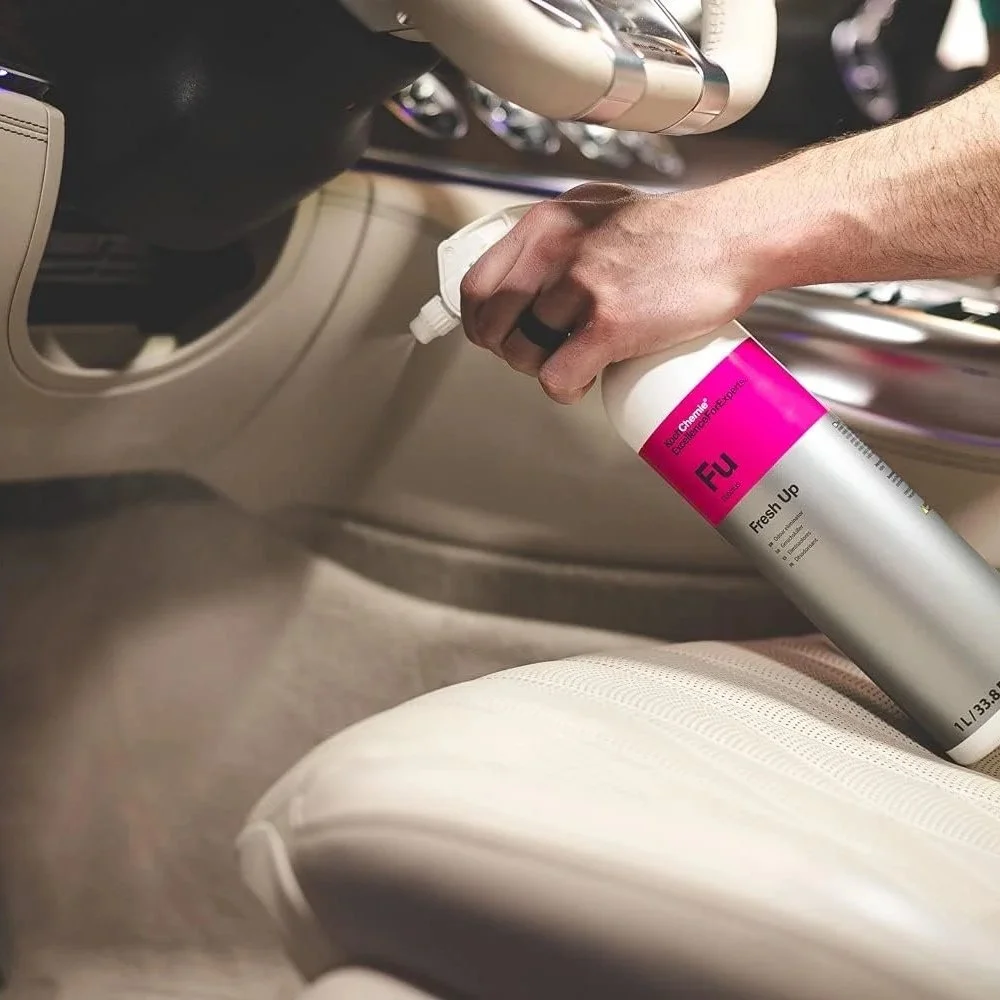 Koch-Chemie Fresh Up works at the molecular level — it doesn't coat the smell with fragrance, it breaks down odor-causing molecules on upholstery, carpet, and in the air. It can also be used in the A/C intake for HVAC odors.