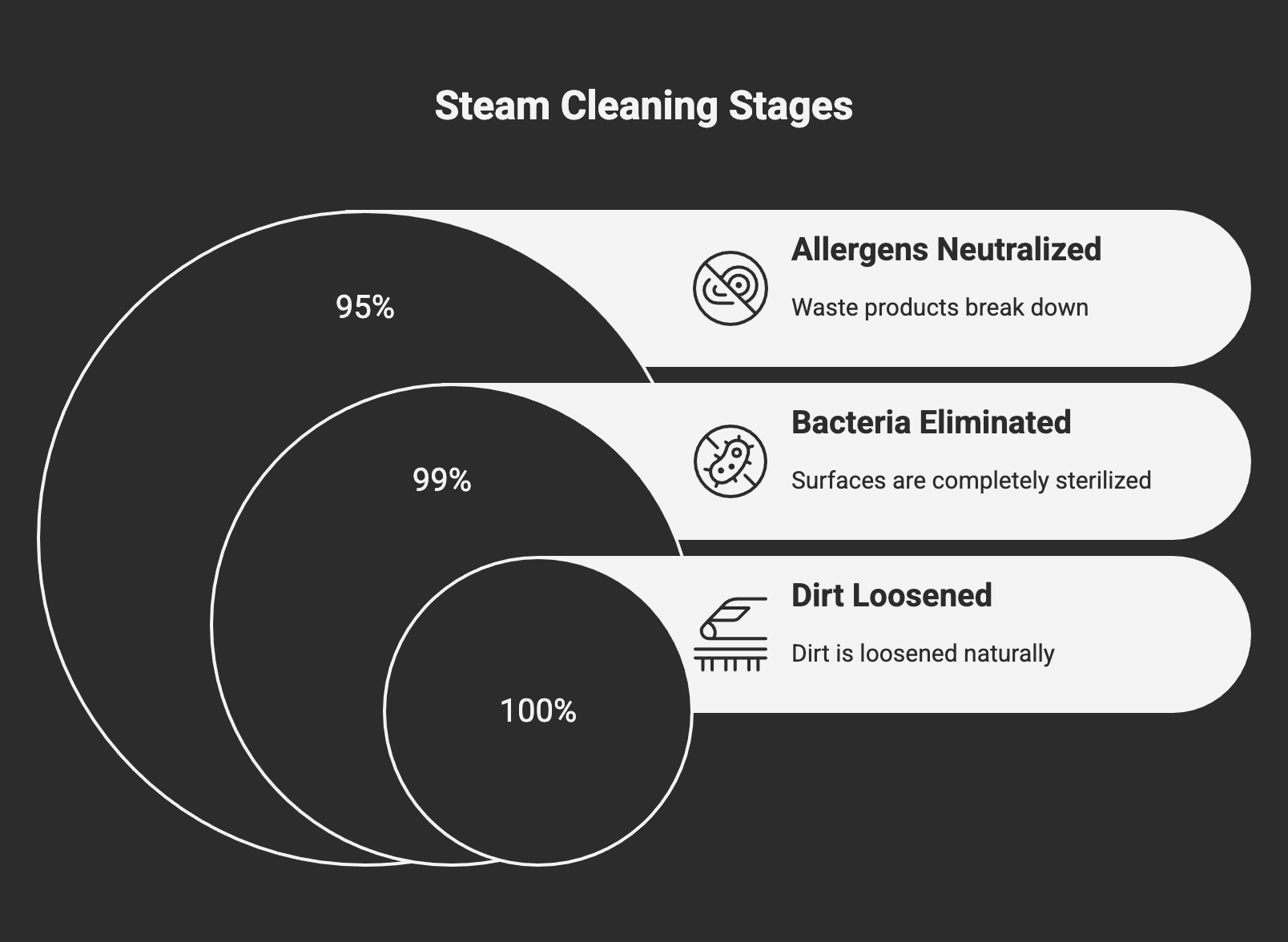 Molecular breakdown: Steam heat breaks the bonds holding dirt to fibers. Instead of scrubbing dirt loose (which damages materials), heat releases it naturally.