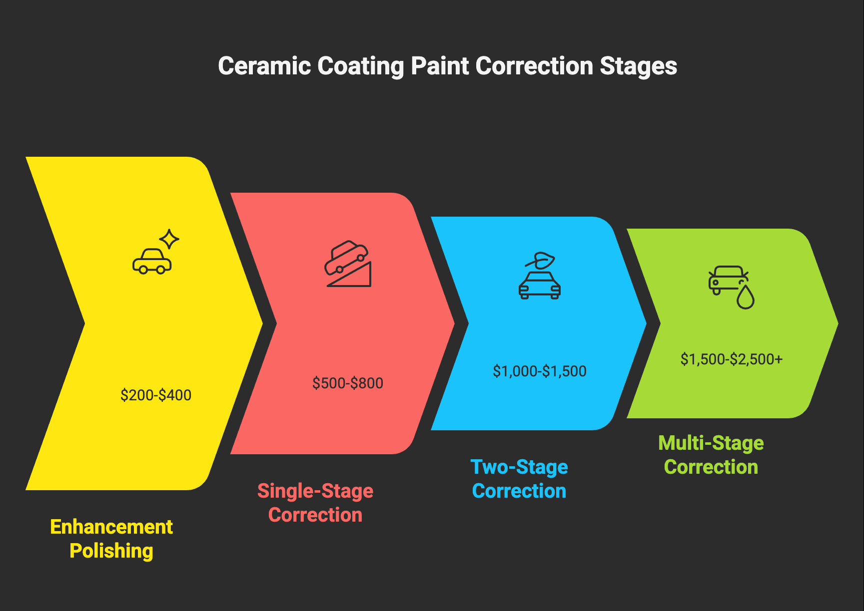 Paint correction is often the most variable cost in ceramic coating applications, sometimes doubling the total project cost for vehicles that need extensive work.